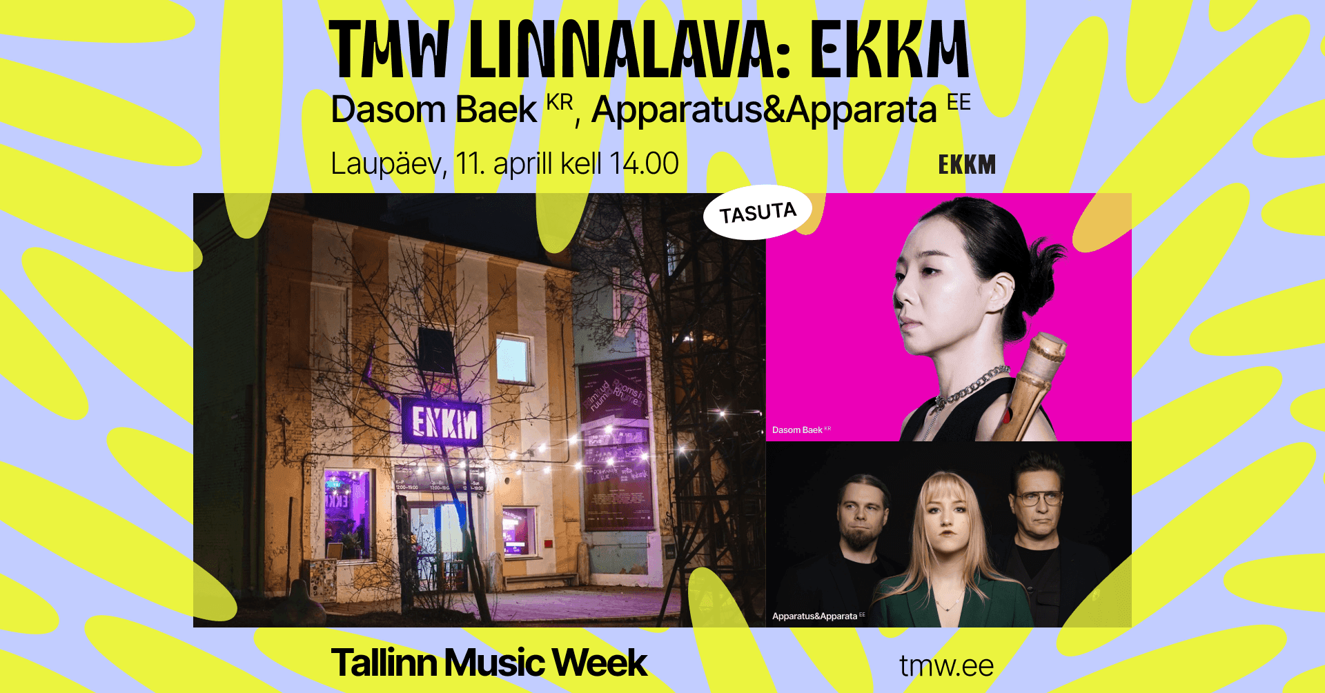 EKKM (Eesti Kaasaegse Kunsti Muuseum) on isetekkeline kaasaegsele kunstile pühendunud asutus, mis toimib eelkõige avaliku mittetulundusliku näitusemajana ning varjamatult isemoodi kunstimuuseumina. TMW 2026 tasuta linnalava programmi raames esinevad siin Koreast pärit eksperimentaalmuusika viljeleja Dasom Baek ning kohalik trio Apparatus&Apparata.