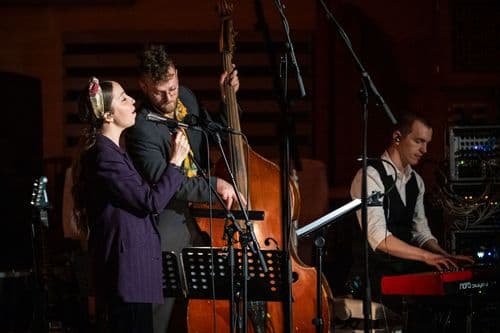 On stage are Maarja Aarma (voice), Karl Madis Pennar (guitar, double bass), and Mikk Kaasik (keyboards), joined by the ETV Girls’ Choir conducted by Aarne Saluveer.